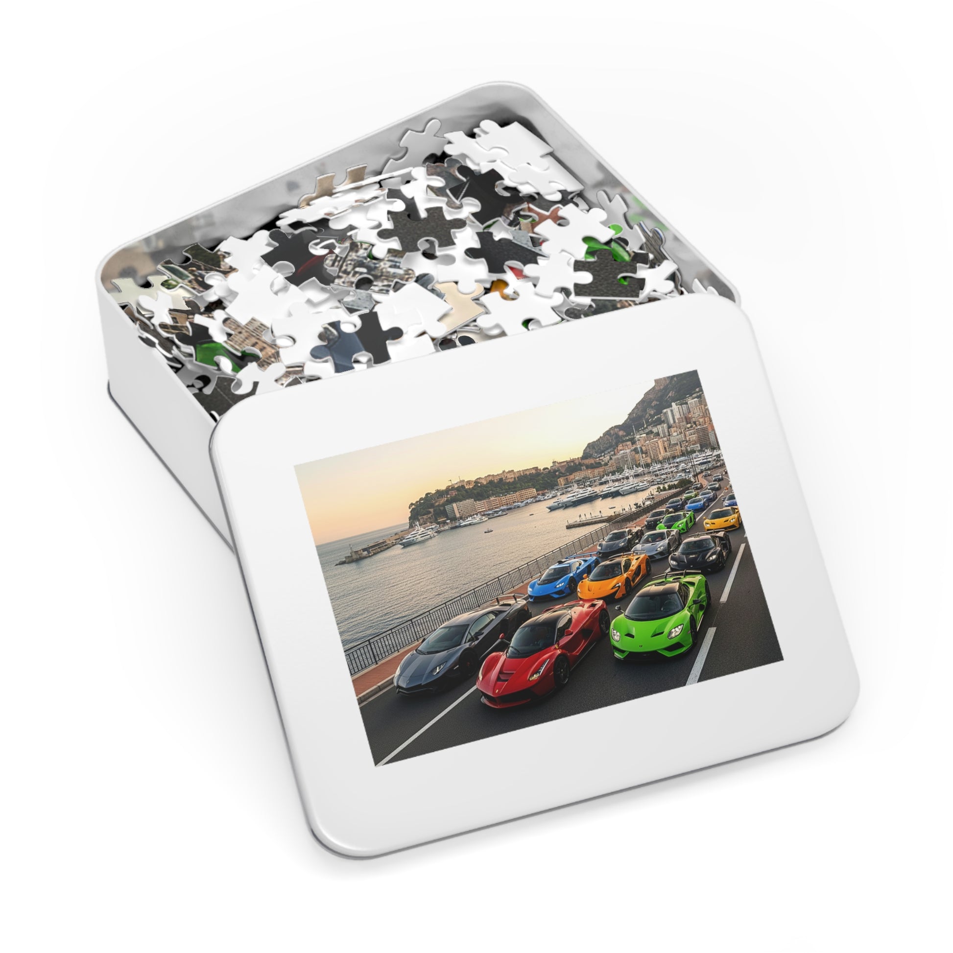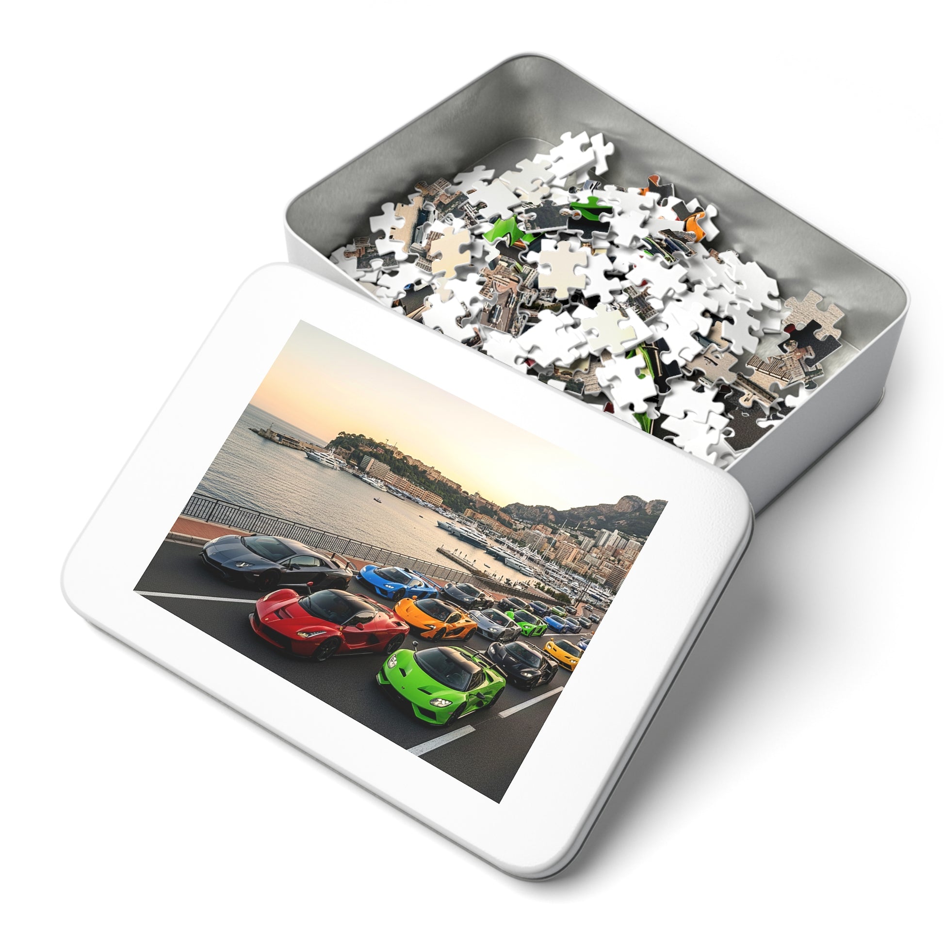 Bring the energy of a sunlit coastal supercar rally to your table with this custom jigsaw puzzle, printed in vivid full color on glossy chipboard and packaged in a sleek white metal tin. Each piece fits with satisfying precision, revealing a lineup of exotic cars cruising along the waterfront—framed by a marina, warm reflections, and a soft pastel sunset.